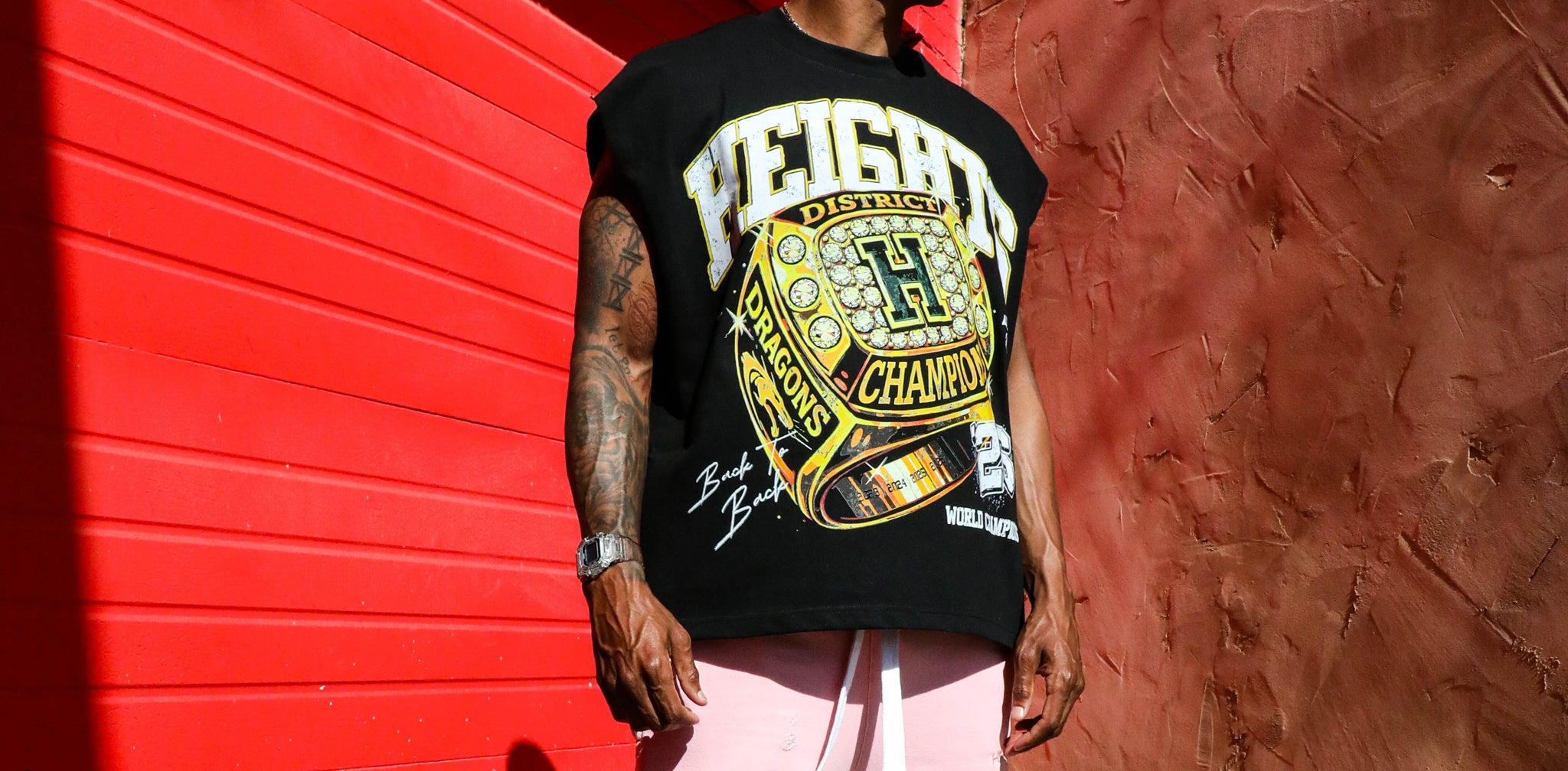 Everything we do at Heights District is built in-house at our Dallas, Texas factory. From printing and production to shipping, every piece moves through our hands right here. Our team also handles all content creation, photography, styling, and collaborations out of our flagship space in the Design District. We take pride in the quality of our blanks—every tee is made from 9.0 oz heavyweight cotton and cut and sewn by our own team to ensure the fit, structure, and finish meet our standard.